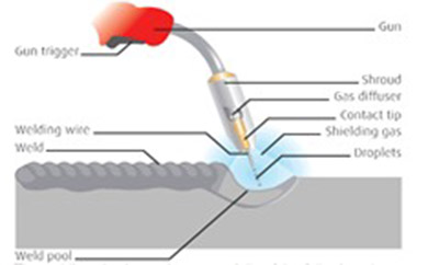 MIG welding is an arc welding process in which a continuous solid wire electrode is fed through a welding gun and into the weld pool, joining two base materials together. A shielding gas is also sent through the welding gun and protects the weld pool from contamination. MIG stands for Metal Inert Gas.